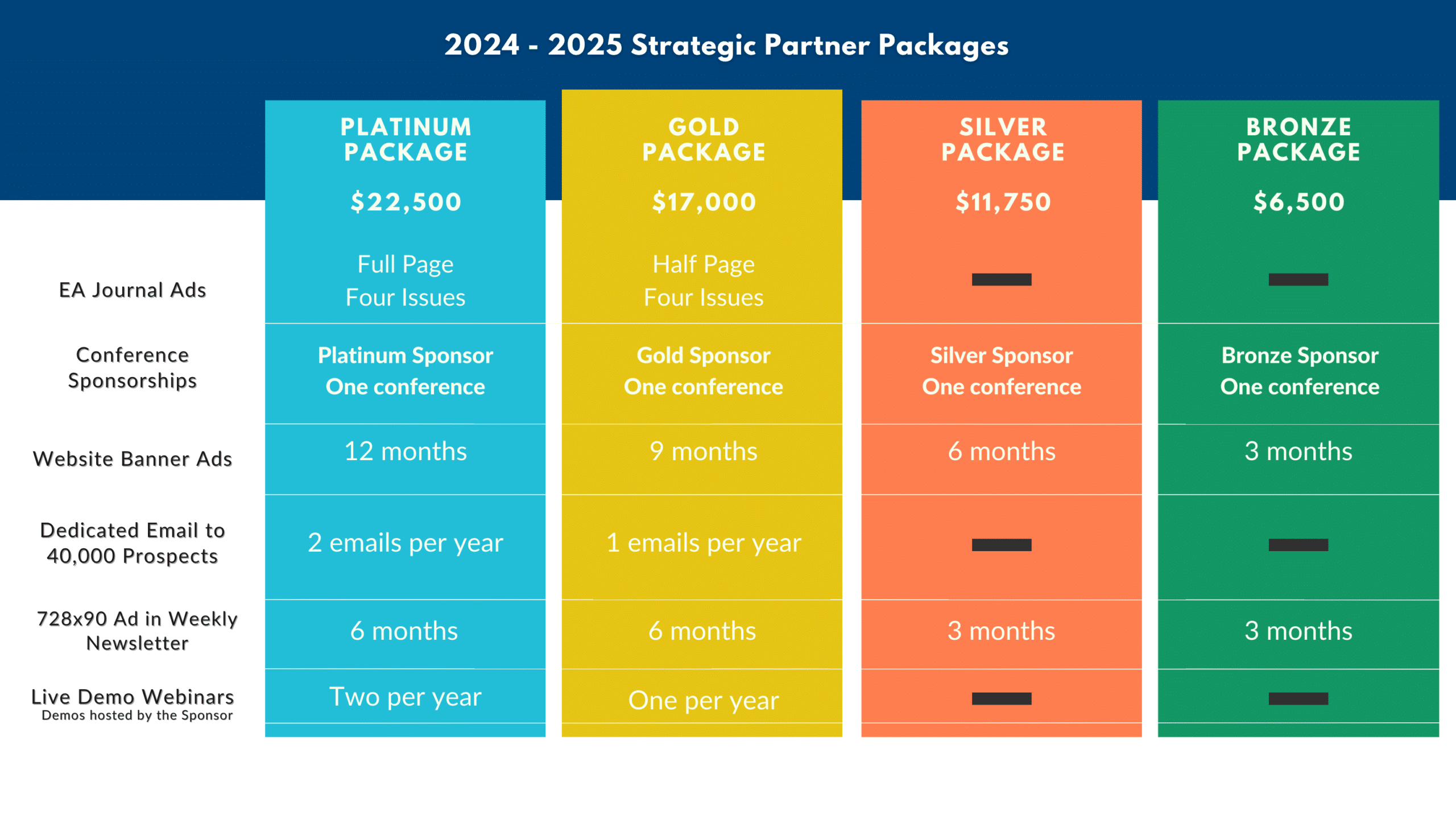 NAEA has multiple opportunities to get your organization in front of our membership. We have strategic partner packages available that include partnering with NAEA through various communication vehicles (as seen in the chart below), event sponsorship packages that include in-person and virtual sponsorships as well as digital and print marketing offerings.